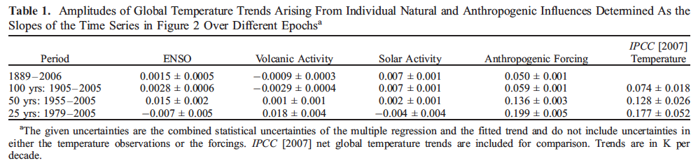 "None of the natural processes can account for the overall warming trend in global surface temperatures. In the 100 years from 1905 to 2005, the temperature trends produce by all three natural influences are at least an order of magnitude smaller than the observed surface temperature trend reported by IPCC [2007]. According to this analysis, solar forcing contributed negligible long-term warming in the past 25 years and 10% of the warming in the past 100 years"