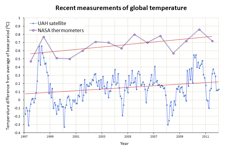 Figure 3 - Annual measurements of temperature changes from NASA thermometer data, and monthly measurements from UAH satellite data along with least-squares trendlines showing warming. Starting the trend in 1998 reduces the size of the warming trend, but it is still warming. NASA data used as British data is currently being updated and latest version is not available online. Measurements of air temperature for the past 15 years were the data specially selected by the GWPF think tank and the Daily Mail's journalist to try and persuade people that global warming has stopped.
