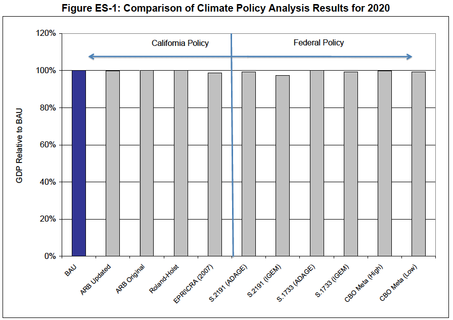 What about the costs of a California-specific cap and trade system? CARB was required to perform an economic analysis of their proposal, and found that AB 32 will result in less than a 0.2% change between 2007 and 2020 (either positive or negative) in Gross State Product, personal and per capita income, and labor demand compared to a business-as-usual scenario. While energy costs are expected to rise slightly, they are also predicted to be more than offset by decreased demand due to increased energy efficiency as a result of the legislation. CARB notes that their results are very similar to the low-gross domestic product (GDP) impact estimates of similar proposed federal cap and trade legislation (Figure 2).