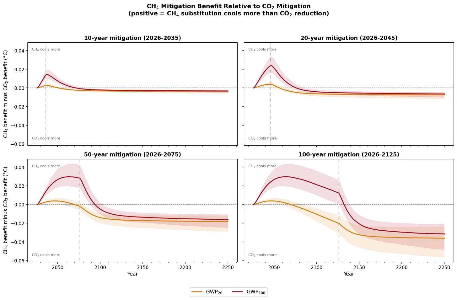 We can also more directly look at the difference in global temperatures over time if we chose to mitigate methane emissions instead of CO2 emissions. In the figure below, values above zero reflect periods when we get more cooling from methane reductions than from CO2, while values below zero show periods where CO2 reductions give us a bigger climate benefit. Here the GWP100 metric provides at least some period of climate benefits, while GWP20 only gives a very short term boost.
