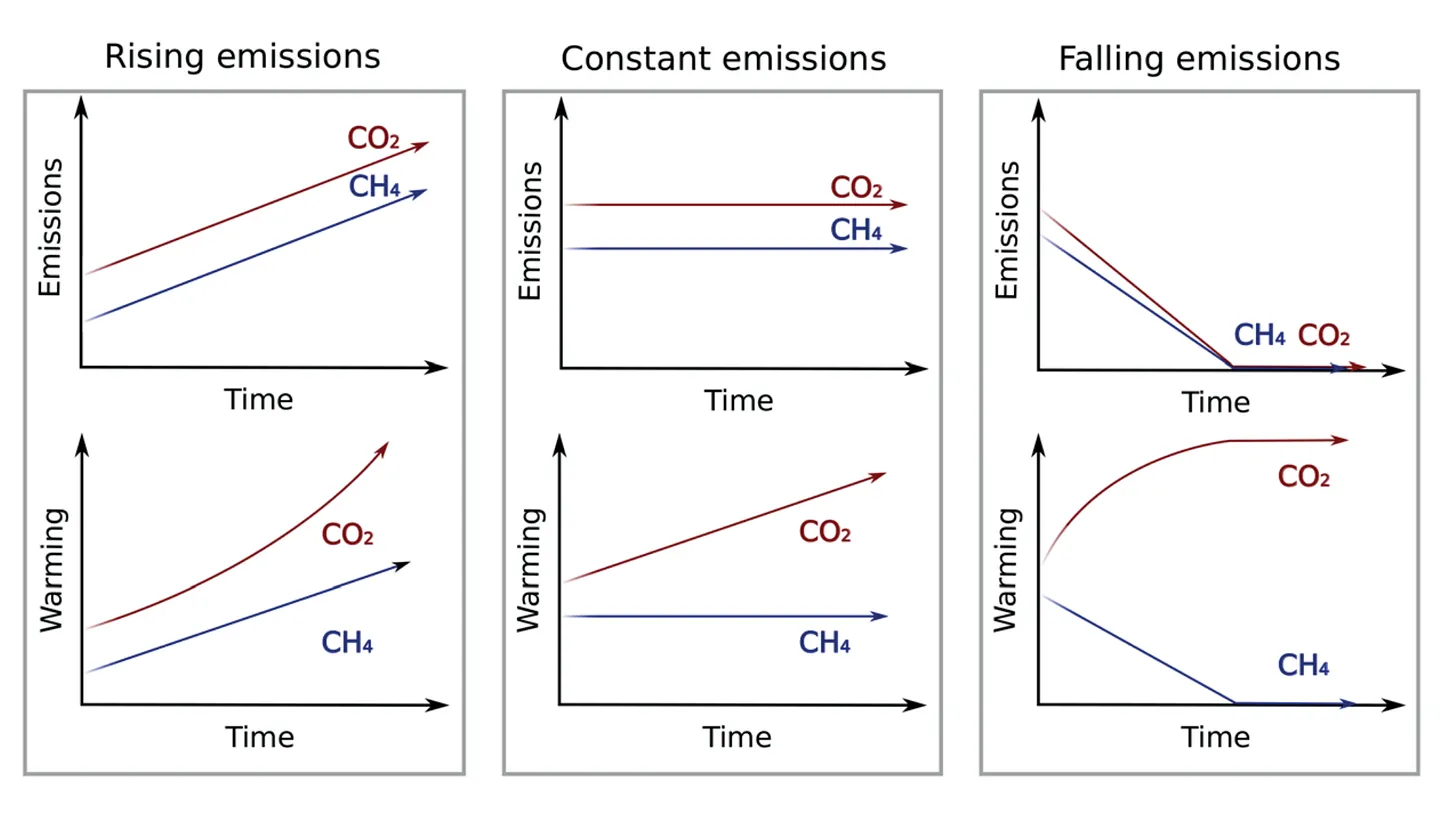 If emissions of methane increase, we get warming. If they stay flat, their temperature effect is constant, while if they decline we get cooling. CO2 emissions, on the other hand, always warm the planet. Increasing CO2 emissions cause warming to speed up, flat CO2 emissions cause steady warming, and decreasing CO2 emissions slow (but do not stop) warming. The only way to get cooling with CO2 is to actively remove past emissions from the atmosphere.
