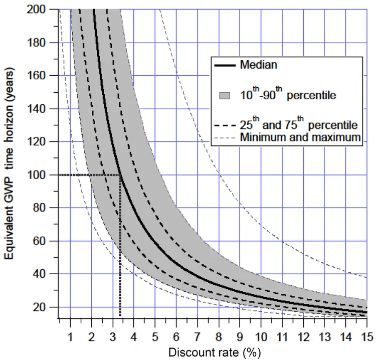 2 Other papers in the literature find similar values; Mallapragada and Mignone (2019) also finds that GWP100 is equivalent to a discount rate of 3%, and that GWP20 equates to a discount rate of >7%.