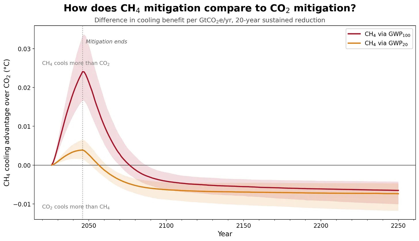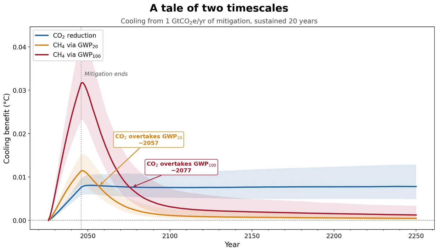 If we use a 20-year GWP period to compare methane and CO2, we get the worst of both worlds. Not only does the cooling benefit of methane mitigation not persist, but it’s not that much greater than CO2 during the period of emissions. This is because we need to cut a lot less methane (only around 12.1 megatons per gigaton of CO2) when using GWP20 compared to a much larger reduction (33.6 megatons) when using GWP100.