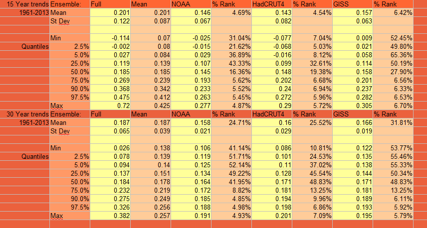 3) One way to address which regression gives the most accurate result would be to compare their adjusted trends across all trend intervals to see if they come out the same. If they varied widely the adjustment is not reliable. Unfortunately Fife et al saw fit to only compare across to trend intervals. However, comparing the mean of all trend intervals in a given period should largely average out short term factors such as ENSO and volcanic adjustments. The result will be a fair estimate of the underlying trend. When we do so with CMIP5 and with the three main temperature records we fins an underlying trend for CMIP5 matching that for Fyfe et al, and for CMIP4, and a discrepancy between observations and models far closer to that obtained by Foster and Rahmstorf than that obtained by Fyfe et al. That give greater confidence in the former than the later: