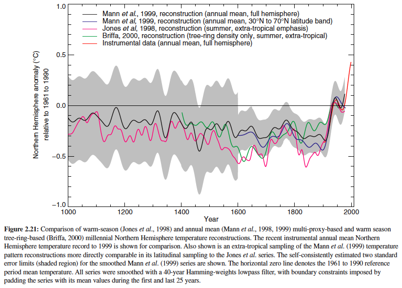 But this was one isolated instance that occurred more than a decade ago. The Review did not find anything wrong with the overall picture painted about divergence (or uncertainties generally) in the literature and in IPCC reports. The Review notes that the WMO report in question “does not have the status or importance of the IPCC reports”, and concludes that divergence “is not hidden” and “the subject is openly and extensively discussed in the literature, including CRU papers.” [1.3.2] How do the IPCC portray the temperature reconstructions of Mann and Briffa? In the 2001 Third Assessment Report (TAR), the Chapter 2 of Working Group 1 (WG1) presented reconstructions from Mann et al. (1999), Jones et al. (1998), and Briffa (2000) in Figure 2.21: