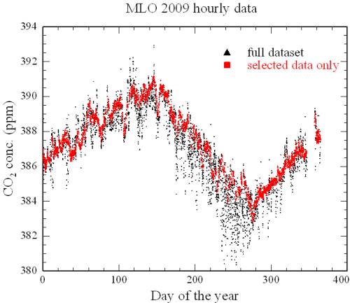Thinking that the Mauna Loa record is affected by the presence of the volcano implies that Keeling didn't notice it. Keeling was looking for the best places where to perform accurate background CO2 measurements; he picked two, Antarctica and Mauna Loa. To understand why the Mauna Loa record is so accurate and representative of the northern hemisphere background CO2 concentration, we need to know how the measurements are performed and how they are analyzed. First I'll start with the obvious advantages of the Mauna Loa Observatory (MLO) as a place to measure the background CO2 concentration. It's on an island in the middle of the ocean; it's at high altitude; no vegetation whatsoever around (take a look at these nice pictures of the site). In this way human and vegetation influences are minimized. But yes, the MLO sits on a volcano and we all know that volcanoes have the bad habit to pour (among other things!) CO2 in the atmosphere. When the instrument happens to be downwind from a source of CO2 (yes, they also measure wind intensity and direction up there), it detects wild and rapid fluctuations of the concentration due to the turbulent mixing of the air. These fluctuations are easily identified and eliminated. Strangely enough, this is not the hardest problem to solve. A more subtle effect is due to the diurnal cycle of the winds along the slopes of the mountain. After sunrise, the rising air from the warming land causes the winds to go uphill. Due to the diurnal photosynthesis cycle, this air is impoverished of CO2. After sunset this process reverses and the winds going downhill bring "clean" air from higher altidudes. CO2 concentration measurements are taken continuously but are analyzed on a hourly basis. Keeping in mind that what they want to measure is the background concentration, on these short time scales large changes are not expected. The standardized data selection procedure follows four steps: