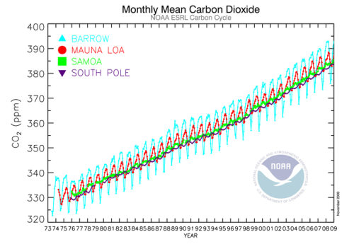 We note a much larger annual cycle in the northern hemisphere (Barrow and Mauna Loa) than in the southern hemisphere (Samoa and South Pole). Also, the cycle is larger at Barrow than at Mauna Loa. It is due to the seasonal cycle of land vegetation and reflects the amount of land in the respective hemispheres (northern vs southern) and the proximity to the source (Barrow vs Mauna Loa). But the overall trends, from the southern to the northern hemisphere and from the poles to the equator, are pretty consistent. Apparently people at NOAA know what they are doing. It's not by chance that the Mauna Loa CO2 record is considered one of the best records in climate science. Updated on 2010-11-06 by Riccardo. |