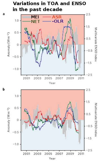 ENSO-induced changes in radiation flux at the top-of-the-atmosphereAs mentioned in the introduction, the satellites which measure incoming and outgoing radiation at the top of Earth's atmosphere (TOA) cannot measure the small planetary energy imbalance brought about by global warming. It is over a hundred times smaller than the energy coming and going from the Earth. But, despite lacking absolute precision, the measuring instruments aboard the satellites are very stable. Therefore the large fluctuations at the top-of-the-atmsophere during ENSO (El Niño/La Niña) present another approach to tracking changes in Earth's energy imbalance. El Niño and La Niña are not only intervals when heat within the system is distributed around the planet, but also periods which see a net loss of heat by the Earth (El Niño) and a net gain of heat (La Niña). Over the long-term these intervals balance out to zero. This net loss/gain of planetary energy during El Niño/La Niña is ishown in figure 3 for the tropics (a) and the global situation (b).