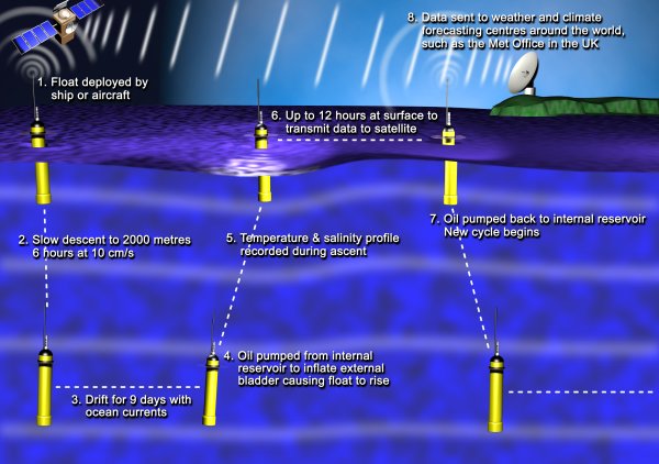 Figure 1 - typical dive cycle of the ARGO submersible float system - the most detailed set of ocean heat observations yet obtained. Image from UK Met Office. An exercise in accountingEarth's energy budget is determined by measuring how much energy comes into the Earth system from the sun, how much is lost to space as heat, and accounting for the remainder on Earth. Very little of this Earthbound energy goes into warming the atmosphere and land because they have a limited capacity to store heat. Likewise the energy required to melt ice is comparatively small. The oceans, however, cover over 70% of the Earth's surface and, due to their enormous heat capacity compared to that of the atmosphere and land, store over 90% of the excess energy from global warming. Quite obviously then, accurate measurements of ocean warming are crucial to balancing Earth's energy budget. A little ocean heat content historyThe ARGO float network consists of 3000 autonomous devices, distributed around the world's oceans, that sink down to depths of up to 2000 metres taking measurements of ocean temperature, as they ascend up through the water column. The system began to be rolled out in 2000, and by 2003 made up the majority of ocean heat measurements. The full roll-out of the 3000 floats was completed in late 2007. Although ARGO has not been without it's fair share of problems (as with any new technology), it represents a vast improvement over previous methods of sampling subsurface ocean temperature, such as the expendable bathythermographs (XBT's). These are ship-launched devices that unfurl a trailing a copper wire as they descend down into the depths. It's through this wire which temperature information is transmitted back to a data collection system onboard the ship. Unlike the ARGO floats, XBT's don't have pressure sensors to measure depth, instead this is calculated by the rate at which the XBT falls. This calculation is carried out by software embedded in the XBT, and this timestamping of the temperature data is how depth is determined. Unfortunately this method has led to numerous problems in the ocean heat content record. See Abraham (2011). From 1990 to 2002 these XBT's made up the bulk of ocean heat measurements, however because they were sparsely sampled in both time and space, numerous corrections and mapping strategies have had to be employed to remove errors and bias from the data set. From around 2002-2003, during the transition from XBT to ARGO, global ocean heating seems to decline. See figure 2.