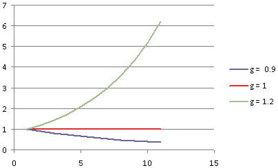 When does positive feedback lead to a "runaway"?To understand this, consider first the "classic" example of positive feedback: The output of an amplifier is plugged back into its own input. This can lead to a sustained shriek. How does this work mathematically? A simple model: Start at Input level = Io, and call the gain factor g: - Output = g * Input = g*Io - Input' = Output = g*Io and then: - Output' = g * Input' = g*g*Io - Input'' = Output' = (g2)*Io and again: - Output'' = g * Input'' = (g3)*Io - Input''' = Output'' = (g3)*Io and so on... If you work the math, you can see that Output(n) = (g(n+1))*Io; but another way to figure it out is to use the two equations in a spreadsheet, starting out with Input(1) = Io = 1, with the equations: Output(n) = g * Input(n) Input(n+1) = Output(n) Figure 1 shows the results, for three different values of g: {0.9, 1, 1.2}.