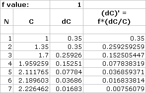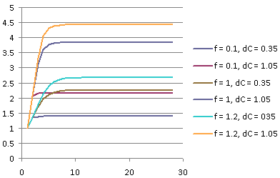The vertical axis shows the increase of temperature, and the horizontal axis shows the number of iterations of feedback. Trying three different values of the feedback parameter f, {0.1, 1, 1.2}, and two values for the initial dollop, {35%, 105%}, we see: