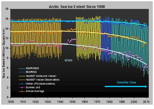 If we look at the series of animations in figure 2, we see the that during the freezing season sea ice extent in any given year grows from the summer minimum until it butts up against the coastline. The ice edge can only move further South by advancing through the relatively narrow channels leading from the Arctic Ocean, such as the Fram and Bering straits. For the Arctic, there are records of the annually advancing and receding ice edge on charts going back to the beginning of the 20th Century, and some from even earlier (Walsh 1978, Mahoney 2008, Vinje 2003). It is possible to reconcile the ice chart and aerial reconnaissance data with satellite data processed for ice edge, despite technical difficulties and several different algorithms and definitions (Comiso 2008, Comiso 2009, Spreen 2008, Anderson 2007). There are enough recent overlapping independent data series to attempt to resolve these differences and develop long term climate records with quantifiable errors (Walsh and Chapman 2001, Rayner 2003, Bronnimann 2008, Cavalieri 2003, Scott and Meier 2010).
