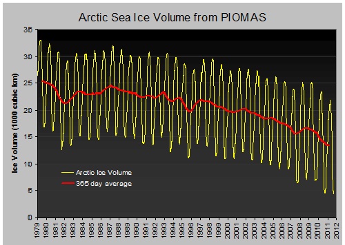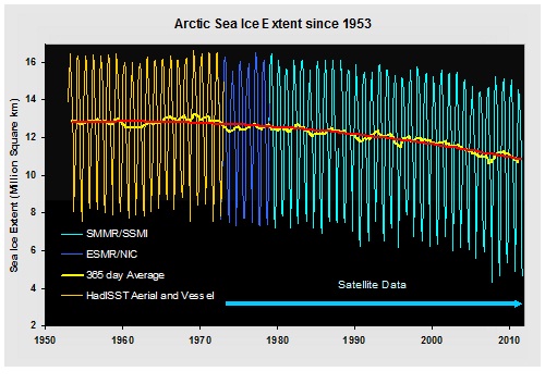 So to summarise, it is the longer term trends in diminishing ice extent, thickness, prevalence of older ice loss and volume, rather than short term interannual changes from one melt season to the next which are important when we talk about the impact of climate change on Arctic ice. As time passes and we add more data points to the charts, we may see brief increases or decreases, but as we now have data extending over several decades, the overall trends will only be marginally affected. Accounting for recent years has only increased the multi-decadal downwards trends. Against this background, claims of recovering Arctic ice are unsubstantiated. Modelling clearly indicates that this ongoing rapid Arctic sea ice loss can not be a result of natural variations (Kay 2011), and we should accept that in the time-span of a single human lifetime the Arctic region has been substantially affected by our activities. We have noted that the amounts of polar sea ice are small compared with the total reservoir of perennial ice in the land based ice caps of Greenland, Antarctica, and the Himalayas. Though average ice mass loss from these regions amounts to hundreds of billions of tons per year, affecting hydrological cycles and global sea level (Church 2011), the loss of Arctic Sea ice has in many ways become representative of this wider ice loss and climate change. As the Arctic region has warmed in recent decades, the thin floating shell of Arctic sea ice has (on average) diminished and progressively thinned, making it increasingly fragile and vulnerable to a number of related mechanisms which are likely to further enhance ice loss. As the ice extent reduces further the amount of solar energy reflected away in the summer will also reduce, whilst the amount absorbed by open ocean will increase. The consequences of this ongoing warming and accelerating summer ice loss for the inhabitants of the region will be profound and long term (Ford 2009) and the loss of the regulating effect of summer sea ice could have consequences for the climate reaching far outside the Arctic region. With the imminent likelihood of permafrost thaw releasing significant amounts of stored Methane into the atmosphere (Isaksen 2011, Koven 2011), with the ecology of the productive Arctic waters changing (Johannessen 2010, McMinn 2011), and with the North West Passage (Shibata 2011) and the Northern Arctic Route being open more frequently (with both routes being open at the same time in 2010 and 2011), offering opportunities for lower intercontinental shipping costs, and with Energy companies expanding operations into the Arctic as reduced and thinner ice levels and rising energy prices change the economics of exploration and extraction, the diminishing ice could also present governments and humankind with dilemmas the significance of which we do not yet fully understand. Are we disinheriting the generations to come? On the evidence so far, we are certainly passing our grandchildren the responsibilities of adapting to the global changes which we, and the unwitting generations behind us, have set in motion.