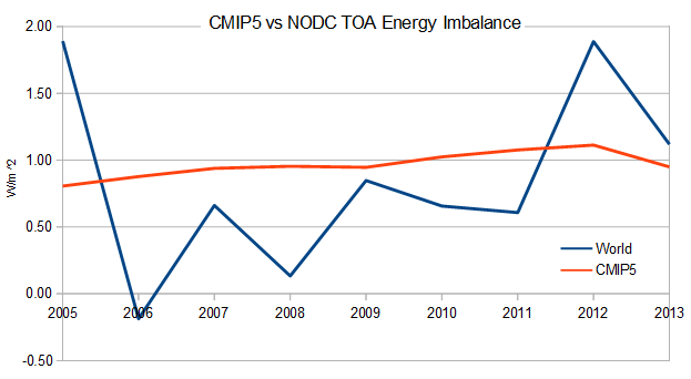 For reproducibility, the 2005 value is based on the difference between the 2005.5 and 2006.5 OHC, which represents therefore the gain in OHC between those periods (ie, the gain in OHC for 2005).  Overall, there is an average difference between the models and observation in this period of 0.12 W/m^2.