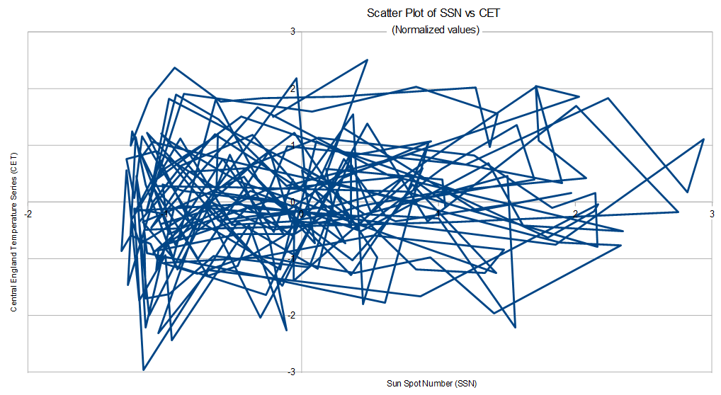 First, as to the "narrow time spans", the SSN data I had downloaded was the monthly values from 1749 available here.  The CET data I downloaded was the mean monthly values available here.  I converted both to annual means as that was easier than converting the CET series to anomaly values, a step that would otherwise have been necessary to avoid incorporating the seasonal cycle (which is noise in this context).  Therefore the "narrow time span" was merely the full overlapping time span on the data I had available.  It was certainly a sufficiently long time span to test your thesis.  Given that the data show a low correlation over 266 years, even if adding in the additional 49 years of annual data available on the SSN increased the correlation, it would merely show that increase to be coincidental.