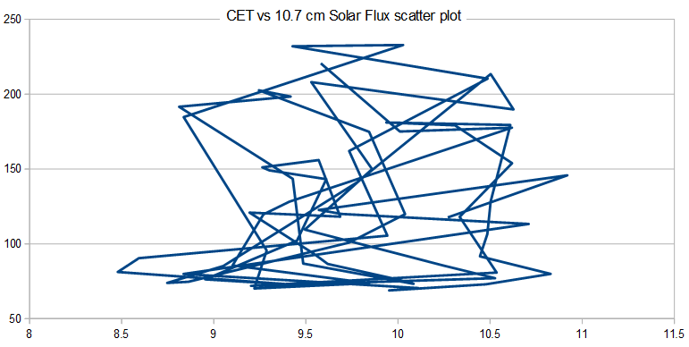 22. Turning to the 10.7 cm microwave flux, using annual values from 1947-2015, the correlation is 0.141 and the r^2 is 0.02, indicating that (ignoring other correlated or anti-correlated causal factors), solar variation accounts for just 2% of CET variation.  For your convenience, here is the scatter plot showing the low correlation: