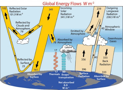 1. Sphaerica (RE: 98), "How do you get "half?" Citation, please." Trenberth actually has it being less than half - meaning more of the surface emitted energy absorbed by the atmosphere is emitted up out to space than is emitted down toward the surface (specifically, he has 157 W/m^2 emitted down and 169 W/m^2 emitted up). So using his numbers for this component would actually result in even more energy reflected away than retained. That aside, when the atmosphere (clouds or clear sky) absorbs surface emitted LW infrared, it re-emits it equally in all directions, which means the net effect through the whole atmosphere is half goes up out to space and half goes down toward the surface. Using Trenberth's numbers, he has the surface emitting 396 W/m^2. Of this, he has 70 W/m^2 passing through unabsorbed straight out to space (40 W/m^2 through the clear sky and 30 W/m^2 through the cloudy sky). 396 - 70 = 326 W/m^2 absorbed by the atmosphere. He then has 169 W/m^2 designated as being emitted up out to space, so 326 - 169 = 157 W/m^2, which is the remainder and is the amount emitted down toward the surface. 70 + 169 + 157 = 396 W/m^2 total emitted by the surface. 70 + 169 = 239 W/m^2 emitted to space. 239 coming in from the Sun + 157 emitted down from the atmosphere = 396 W/m^2 at the surface. A lot of confusion lies in Trenberth having 78 W/m^2 of the incoming energy from the Sun absorbed by the atmosphere and brought to the surface as 'back radiation'. Only it's not 'back radiation', it's 'forward radiation' yet to reach the surface that last originated from the sun - as opposed to 'back radiation' being energy that last originated from the surface. These distinctions are absolutely critical to understanding the constraints Conservation of Energy puts on the system relative to all the energy flows.