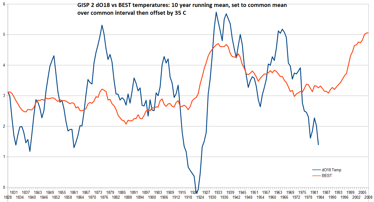 I have not been able to find dO18 based temperature reconstruction brought up to the late 20th century, but the dO18 values to 1987 are available online.  I have used the temperature relationship specified in the University of Washington's annual dataset, along with the temperature relationship specified in Cuffey and Clow (1997), specifically T=(2.15 x dO18) + 43.4.  I have compared the running decadal mean to that for the BEST Greenland data: