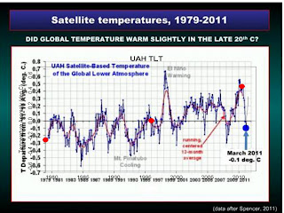 Carter makes much of the satellite record, taking advantage of the fact that when he gave his presentation to the Sydney Mining Club the most recent data point was March 2011, a low point due to the La Nina: