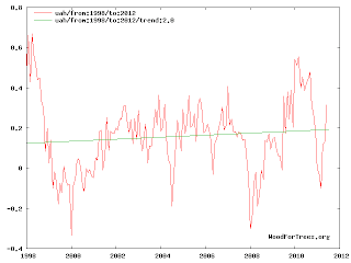 In case you suspect that the reason for the uptrend since 1999 is that I’ve included data after March 2011, I’ll add the trend line using just data from 1999 through March 2011 (in blue):