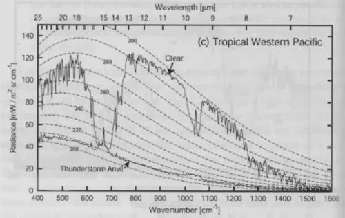 In attempting to answer Concerned Citizen, however, you stated that "Essentially all the energy emitted by the Earth is at the 6.0 km altitude". That is not correct. The "effective mean altitude of radiation" is approximately 6 km, but the effective mean altitude of radiation is just that altitude in the troposphere at which the globally averaged temperature is the same as the brightness temperature of the IR radiation from Earth, averaged globally and across all frequencies. That that is not the same as the altitude from which essentially all radiation is radiated is most easilly seen by comparing the 6 km temperature to brightness radiation of emission from real observations (in this case averaged over April to June from the Central Pacific for two seperate years, see Harries et al, 2001)