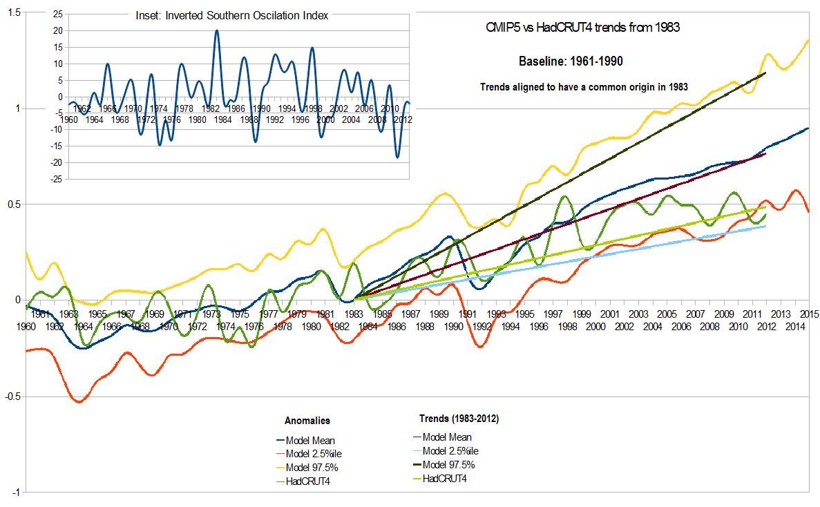 This is especially the case as there are known biases on the observed trends which Spencer knows about, but chooses not to mention. The first of these is the reduced coverage of HadCRUT4, which give is a cool bias relative to truly global surface temperature measures. The second is the ENSO record (see inset), which takes us from the strongest El Nino in the SOI record (which dates back to 1873) to the strongest La Nino in the SOI record. This strong cooling trend in the physical world is not reflected in the models, which may show ENSO fluctations, but do not coordinate those fluctuations with the observed record.
