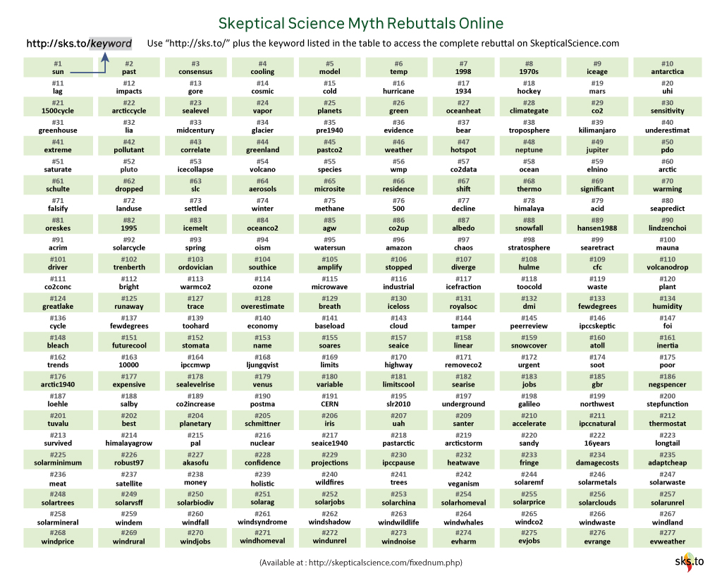 Chart of keywords for finding links to Skeptical Science myth rebuttals.