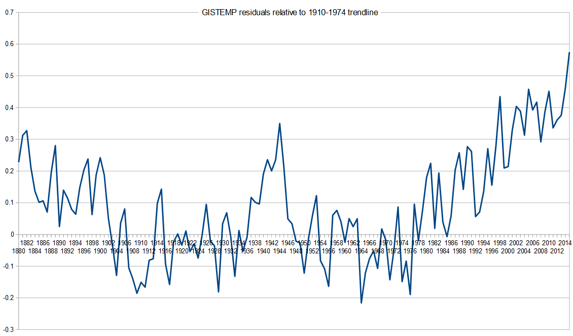 5. Just for Billev's (@1 and @3) benefit, here are the NASA GISTEMP annual values detrended to make the trend from 1880-1945 zero, and with the 1974-2002 trend line of the adjusted data shown: