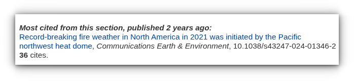 While recently making API changes to improve our background tooling for New Research, we found ourselves unable to resist tapping into a little more information to include in our regular product. There's one key metric to help us all better understand what practicing scientists find most useful (and stimulating) in the torrent of climate-related research reports we sample here each week: "how many investigators cite a work in their own inquiries?" Our knowledge boundaray inexorably expands past any given report, but older results may well be foundational to newer exploration. So, we've added an little retrospective to each domain section in our weekly listing. For each section, we query our data, asking "what paper listed here 2 years ago has been most cited since it appeared?" This new feature appears at the end of each section:
