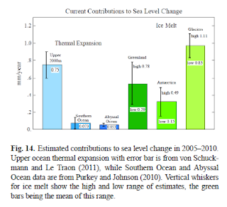 38. Hansen's Figure 14 "Current Contributions to Sea Level Change" in Earth's Energy Imbalance and Implcations shows his latest assessment of the literature which is just prior to the publication of the Jacob, Wahr, Pfeffer and Swenson Nature paper under discussion. If you add the Hansen Greenland and Antarctica middle of the error bar values (0.85 mm/yr) and compare to Jacob et.al. data (1.06 mm/yr) for those areas you see that one thing Jacob et.al. discovered is that more ice may be melting in the places where most of the ice on land on the planet is than a type like Hansen thought. Hansen commented on the error bars in his Figure 14 by referring to sea level data, i.e. his Figure 12 saying "the recent measured sea level rise favors the lower estimates of ice sheet melt". So if you add up his "lower estimates" for Greenland and Antarctica from Figure 14 you get an even lower total, 0.44 mm/yr in comparison to Jacob et.al.'s 1.06 mm/yr. A wild headline could have read "Ice sheet disintegration doubles at poles - scientists stunned!" which might have as much basis in reality as some of the headlines on articles about the Jacob et.al. paper. All of Hansen's low estimates add up to a low estimate for total global ice on land melt contribution to sea level which equals 1.27 mm/yr. The Jacob et.al paper finds the total to be 1.48 mm/yr. Pfeffer, in his Nye Lecture presentation to this years AGU commented that observation of glaciers has tended to be in areas that are easy to get to, as opposed to a representative or comprehensive set of glaciers someone knowledgeable might choose for a dataset.
