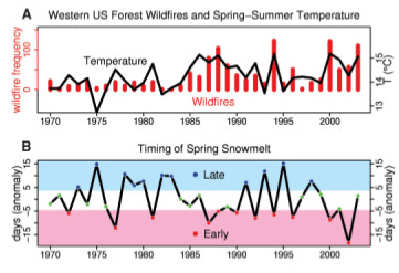 ".........We compiled a comprehensive database of large wildfires in western United States forests since 1970 and compared it with hydroclimatic and land-surface data. Here, we show that large wildfire activity increased suddenly and markedly in the mid-1980s, with higher large-wildfire frequency, longer wildfire durations, and longer wildfire seasons. The greatest increases occurred in mid-elevation, Northern Rockies forests, where land-use histories have relatively little effect on fire risks and are strongly associated with increased spring and summer temperatures and an earlier spring snowmelt."