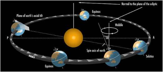 Earth's tilt relative to it's plane of orbit around the sun. Left-hand side=southern hemsiphere (austral) summer. Right-hand side= northern hemisphere (boreal) summer. Image courtesy of the Austalian Bureau of Meteorology