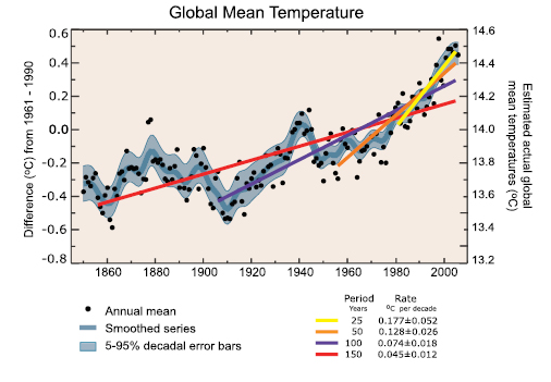 After a rapid rise in global surface air temperatures during the late 1970s to 1990s, the rate of global warming in the last decade or so has slowed. A recent scientific paper, Kaufmann (2011), suggests that once relevant factors are taken into consideration, the observed slow-down from 1998-2008 is in line with scientific understanding of the climate.