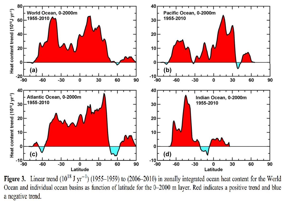 As can easilly be seen, the South Atlantic, South Indian, and North and South Pacific are all warming quite strongly. Of course, Levitus et al (2012), the source of the graph, just divide the worlds oceans up into three oceans, so that the Southern Indian, Southern Atlantic and Southern Pacific oceans by their division includes the Southern Ocean. Perhaps it is flat or cooling?: