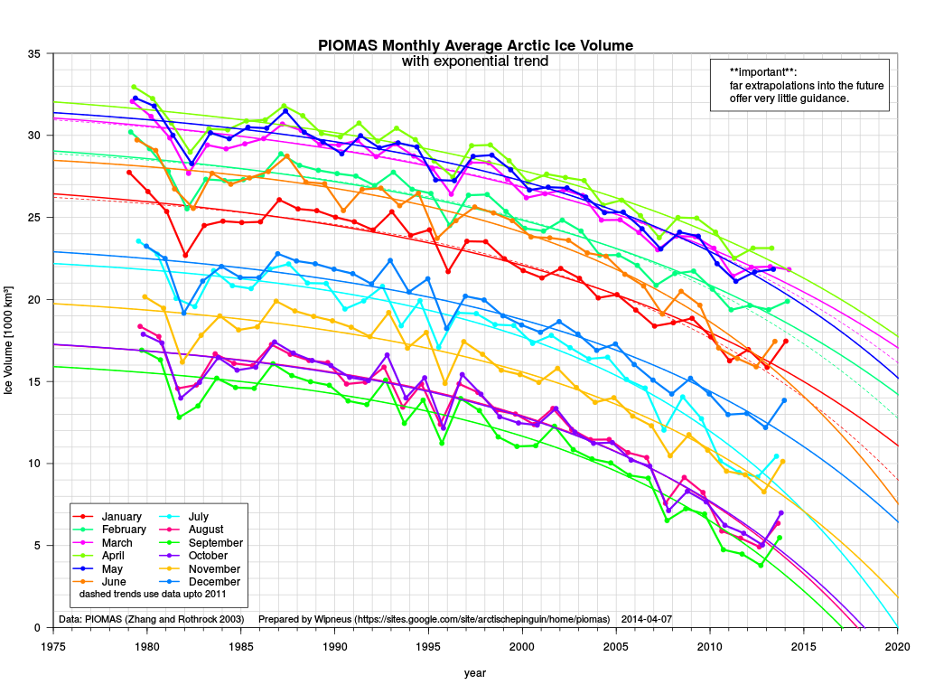 This is a graph of Arctic sea ice volume from PIOMAS since 1979. Each line is one month with the green bottom line being September. The bottom axis is zero volume.